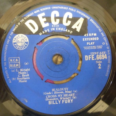 Black vinyl. Decca labels with pushout centre intact. G+ original picture sleeve.
